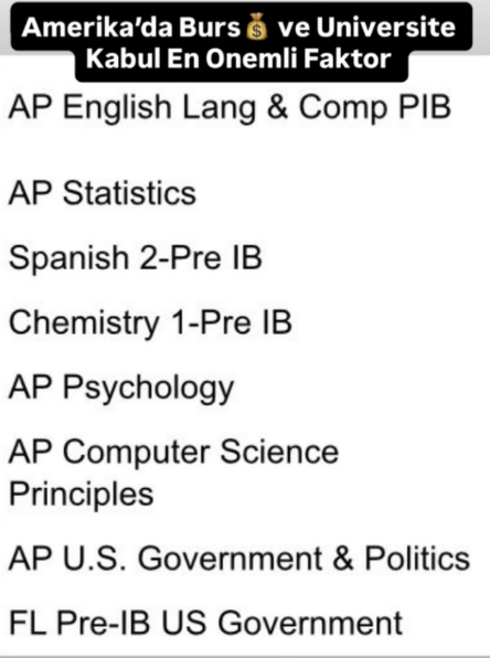 Pelin’in aldığı dersler İngilizce, matematik, psikoloji, bilgisayar bilimleri, Amerikan hükümeti, kimya ve İspanyolca gibi farklı alanlarda ve ileri düzeyde. Bu çeşitlilik ve zorluk, öğrencinin hem akademik bilgisini hem de üniversite başvurularındaki şansını artırıyor.