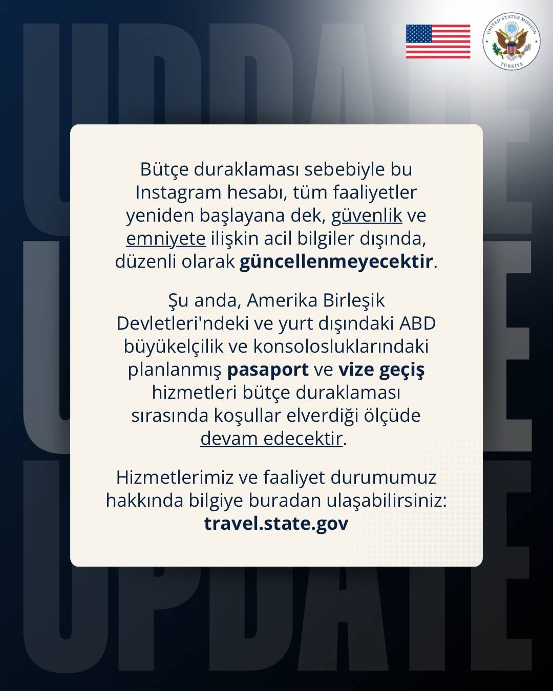 ABD’nin Ankara Büyükelçiliği, sosyal medya hesapları üzerinden yaptığı açıklamada, bütçe duraklaması süresince hesapların düzenli olarak güncellenmeyeceğini bildirdi. Açıklamada, güvenlik ve emniyete ilişkin acil bilgiler dışında paylaşım yapılmayacağı vurgulandı.
