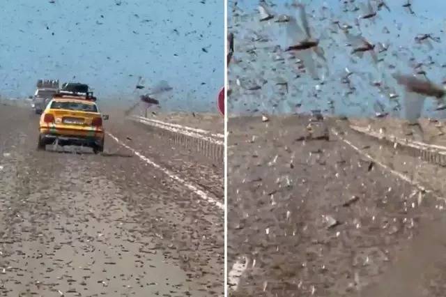Görüntülerde, gökyüzünü ve yolu kaplayan binlerce çekirge bulutu görülüyor. Araçlar sürücülerin görüş mesafesini neredeyse tamamen engelleyen sürünün arasından ilerlemeye çalışıyor. Sürücüler, bu yoğunlukta ilerlemenin tehlikeli olduğunu belirtiyor ve bazı araçların çekirgelerle çarpıştığı görülüyor.