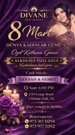New Jersey’de 8 Mart bu yıl ayrı bir heyecana sahne olacak. ATKDD ve Divane New Jersey iş birliğiyle gerçekleşecek gecede kadınlar iftar sofrasında bir araya gelecek, canlı müzik ve özel programla Kadınlar Günü’nü birlikte kutlayacak.