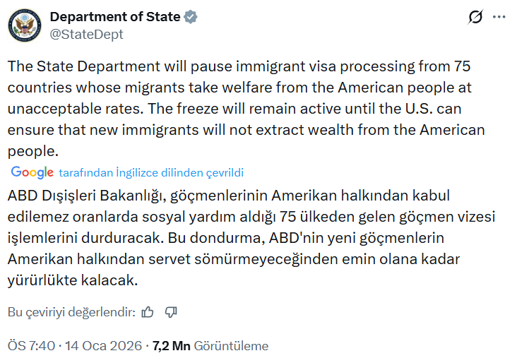 “ABD Dışişleri Bakanlığı, toplamda 75 ülkenin göçmen vizelerinin durdurulduğunu duyurdu. Bu ülkeler arasında Türkiye yer almıyor, ancak Azerbaycan listede bulunuyor. Sosyal medyada tüm vizelerin durdurulduğu yönünde iddialar var ancak resmi açıklamalarda yalnızca göçmen vizeleri, yani Green Card süreçleri kapsanıyor.”