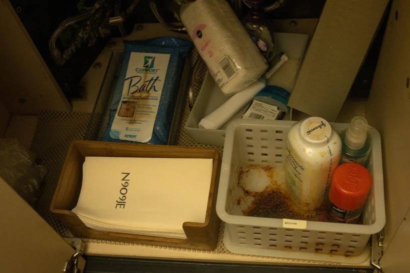 Tıraş losyonları, diş fırçaları, saç tokaları, hatta bebek losyonu ve bebek pudrası gibi ürünlerin hâlâ yerinde olduğu bildiriliyor. Kirli havlular ve çeşitli bakım malzemeleri de kabinde bırakılmış halde.