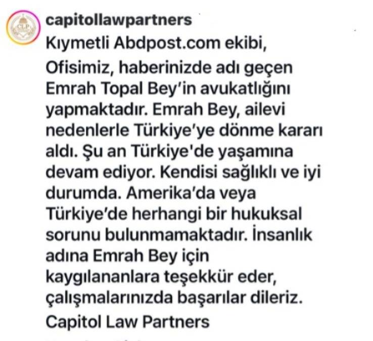 Ancak yapılan resmi açıklamaya göre, Emrah Topal sağlıklı bir şekilde Türkiye’ye dönmüş durumda. Topal’ın avukatlığını yürüten Capitol Law Partners, ABDPost’a yaptığı açıklamada, “Emrah Bey, ailevi nedenlerle Türkiye’ye dönme kararı aldı. Şu an Türkiye’de yaşamına devam ediyor ve herhangi bir hukuki sorunu bulunmamaktadır” ifadelerine yer verdi.