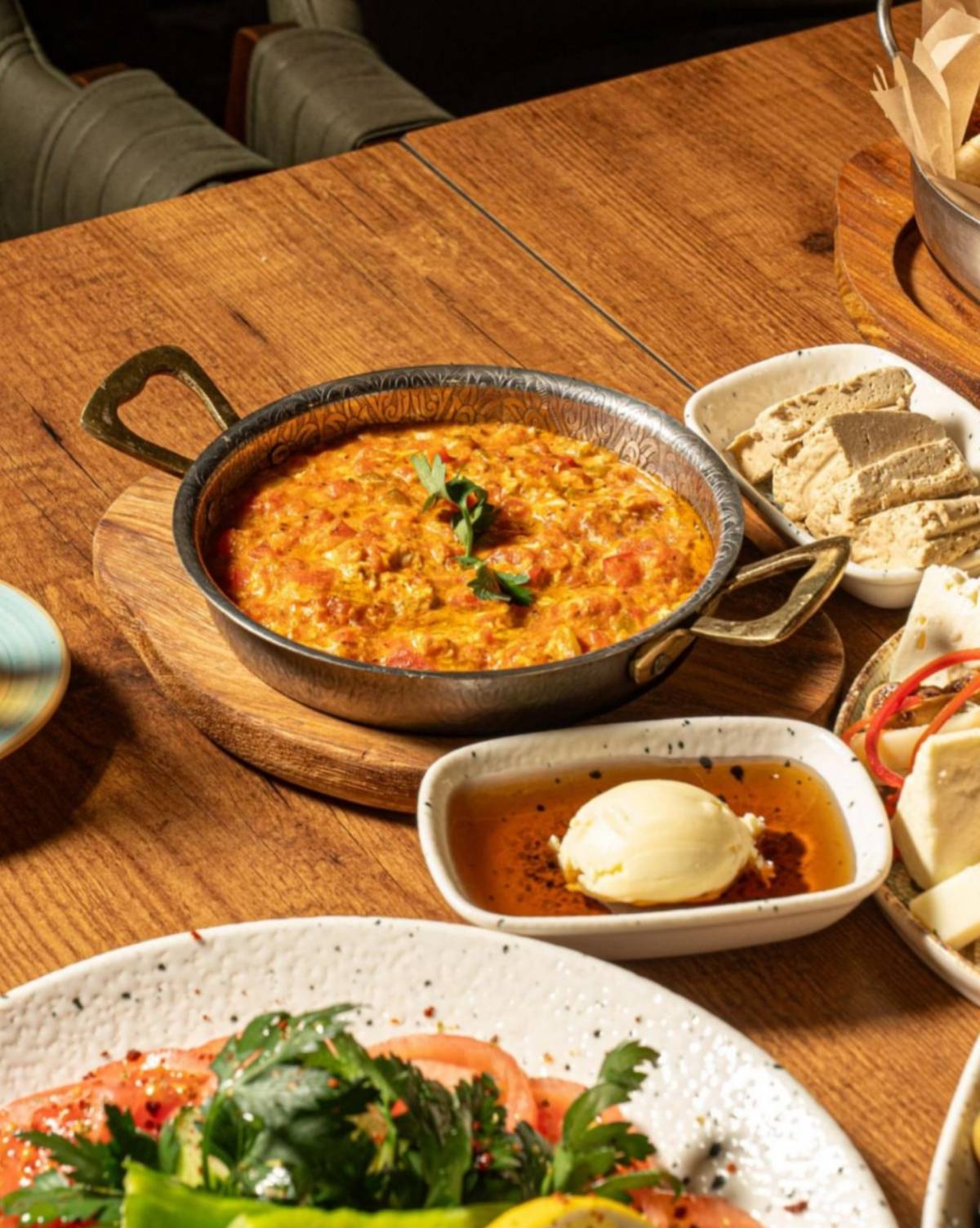 Tazelik ön planda tutulurken domates, salatalık ve söğüş tabakları sofraya canlılık katıyor.
