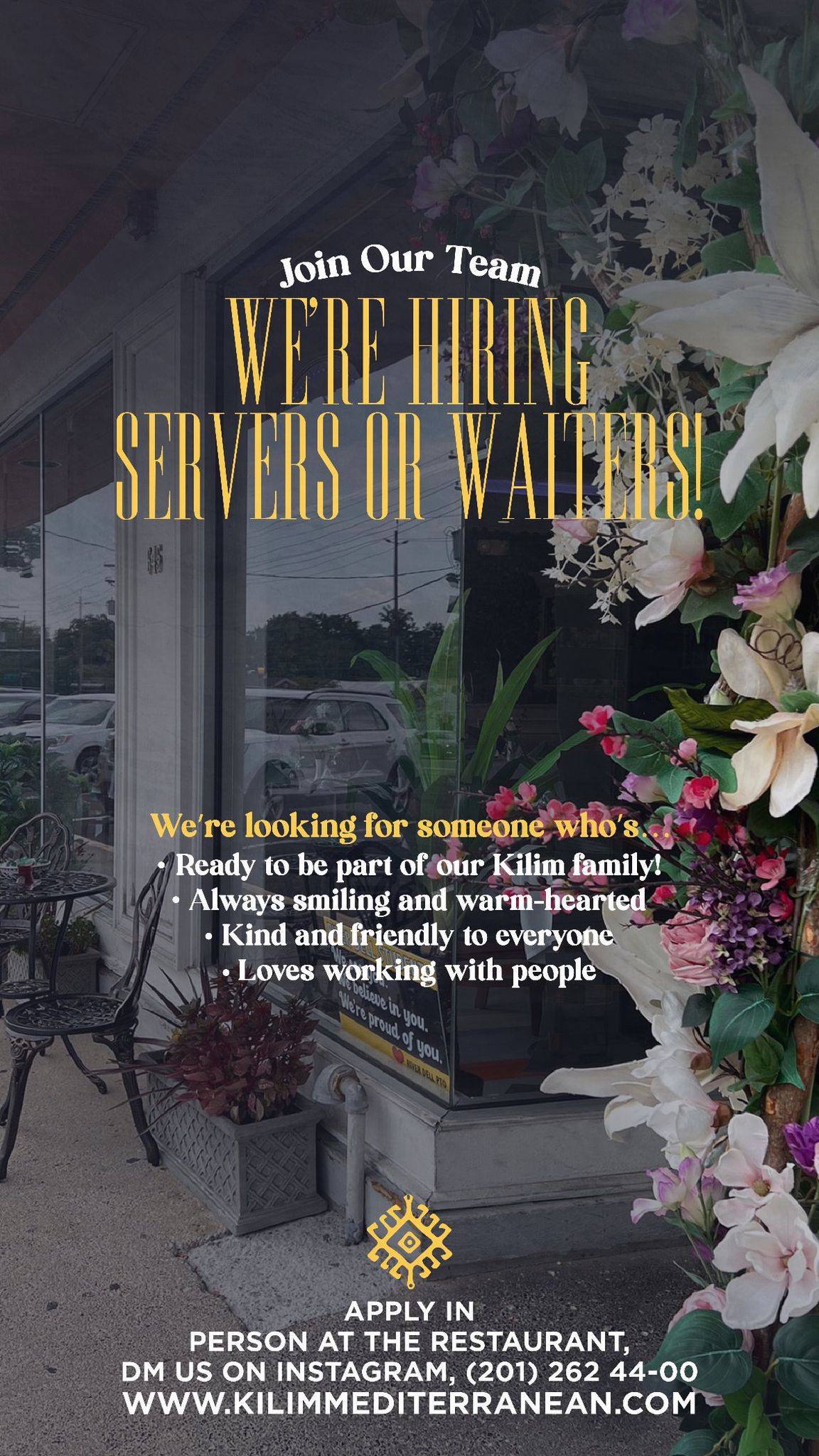 New Jersey’nin River Edge bölgesinde Akdeniz mutfağının sevilen adreslerinden Kilim Mediterranean, büyüyen ekibi için yeni çalışanlar arıyor. Güler yüzlü, insan ilişkileri güçlü ve ekip çalışmasına yatkın adaylar Kilim ailesine katılmaya davet ediliyor.
