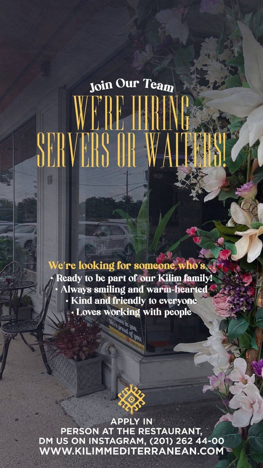 New Jersey River Edge’de yoğun ilgi gören Kilim Mediterranean, artan müşteri trafiğine yetişmek için ekibini genişletiyor. İyi derecede İngilizce bilen, güler yüzlü ve iletişimi güçlü servis personelleri arayan restoran, yeni çalışma arkadaşlarını aile ortamına davet ediyor.