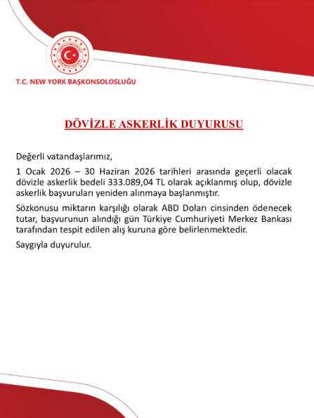 Başkonsolosluk tarafından yapılan duyuruda, dövizle askerlik başvurularının yeniden alınmaya başlandığı bildirildi. Açıklamada, söz konusu bedelin ABD doları cinsinden ödeneceği, ödenecek dolar tutarının ise başvurunun yapıldığı gün Türkiye Cumhuriyet Merkez Bankası tarafından belirlenen döviz alış kuru esas alınarak hesaplanacağı vurgulandı.