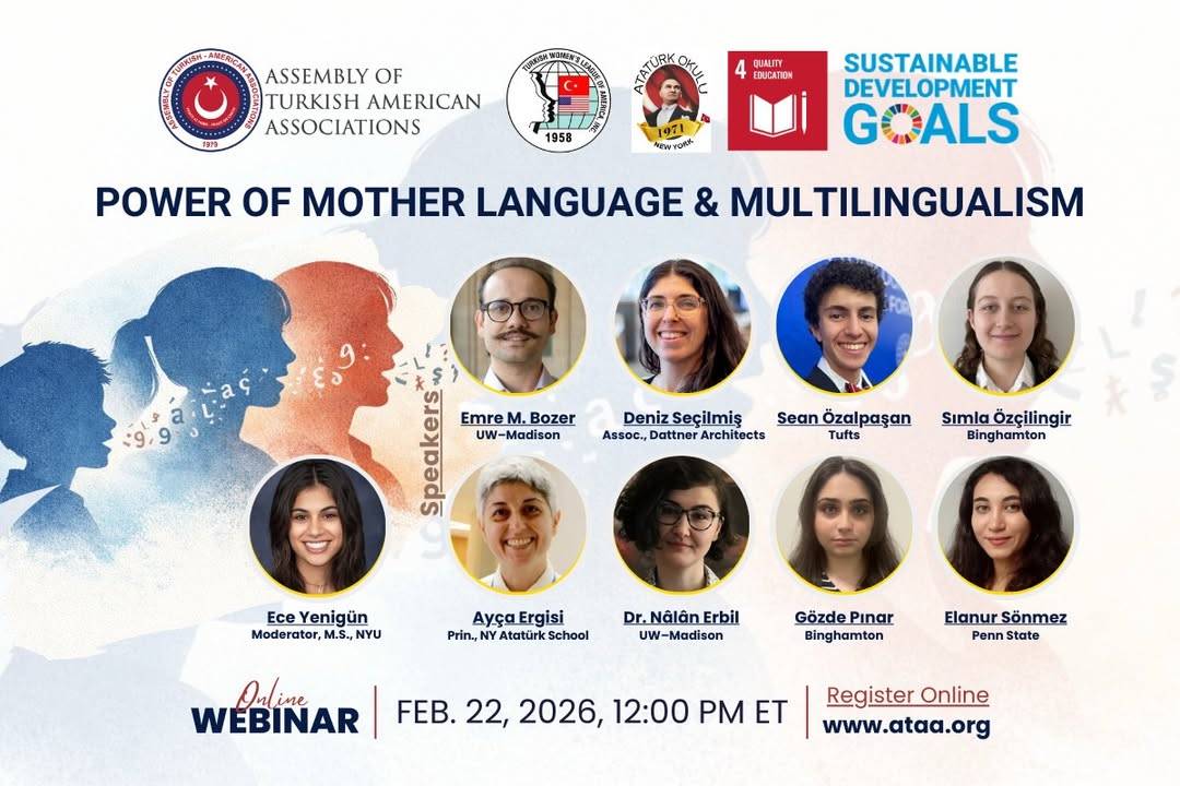 Amerika Türk Kadınlar Birliği, New York Atatürk Okulu ve ATAA iş birliğiyle, “Power of Mother Language & Multilingualism – Anadilin ve Çok Dilliliğin Gücü” başlıklı çevrimiçi etkinlik 22 Şubat 2026 tarihinde gerçekleştirilecek. Program saat 12:00 PM'de başlayacak ve katılım için www.ataa.org üzerinden kayıt yaptırmak gerekiyor.