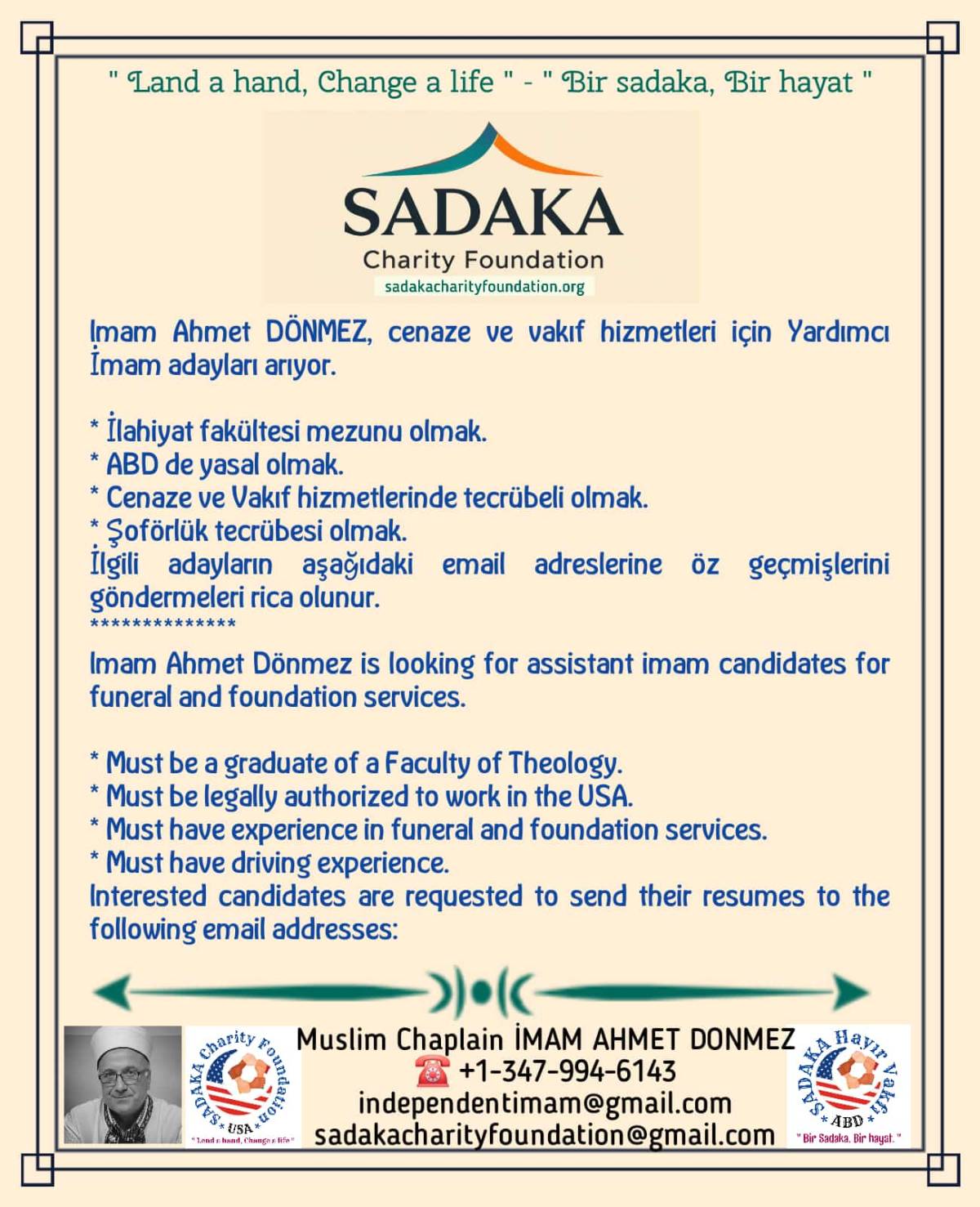 Kimsesiz Müslümanların mezar taşından ihtiyaç sahiplerinin sıcak çorbasına kadar her detayla ilgilenen SADAKA Vakfı, New York’taki hizmet kapasitesini artırıyor. İmam Ahmet Dönmez liderliğindeki ekipte yer alarak toplumun manevi ihtiyaçlarına çözüm üretecek ehliyetli yardımcı imamlar aranıyor.