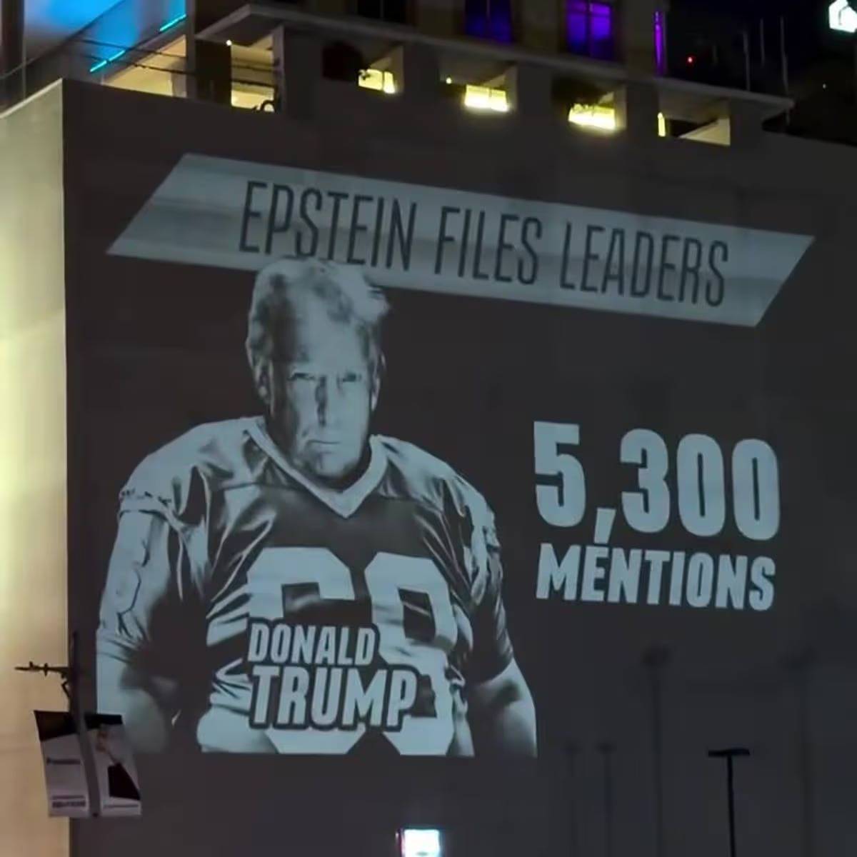Anonim sanatçı kolektifi @vjaybombs tarafından hazırlandığı belirtilen projeksiyon, NFL skor tabelasını andıran bir formatta kurgulandı. Görüntülerde, Epstein dosyalarında adı geçen bazı tanınmış isimler “oyuncu” gibi sunulurken, yanlarında dosyalarda kaç kez anıldıklarını gösteren “istatistikler” yer aldı. Çalışma, Super Bowl atmosferini çağrıştıran enerjik müzikler eşliğinde binaya yansıtıldı.