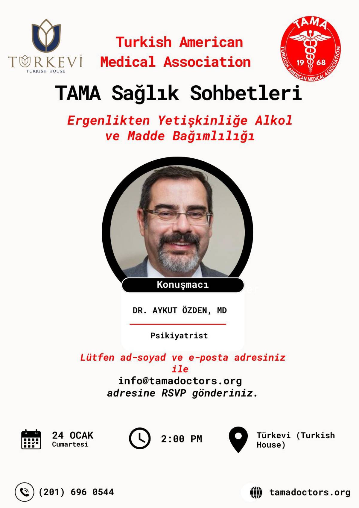 TAMA, madde ve alkol bağımlılığına karşı farkındalık oluşturmak amacıyla Türkevi’nde özel bir etkinlik düzenliyor. Uzman Psikiyatrist Dr. Aykut Özden, bağımlılıkla mücadele ve korunma yollarını anlatacak.