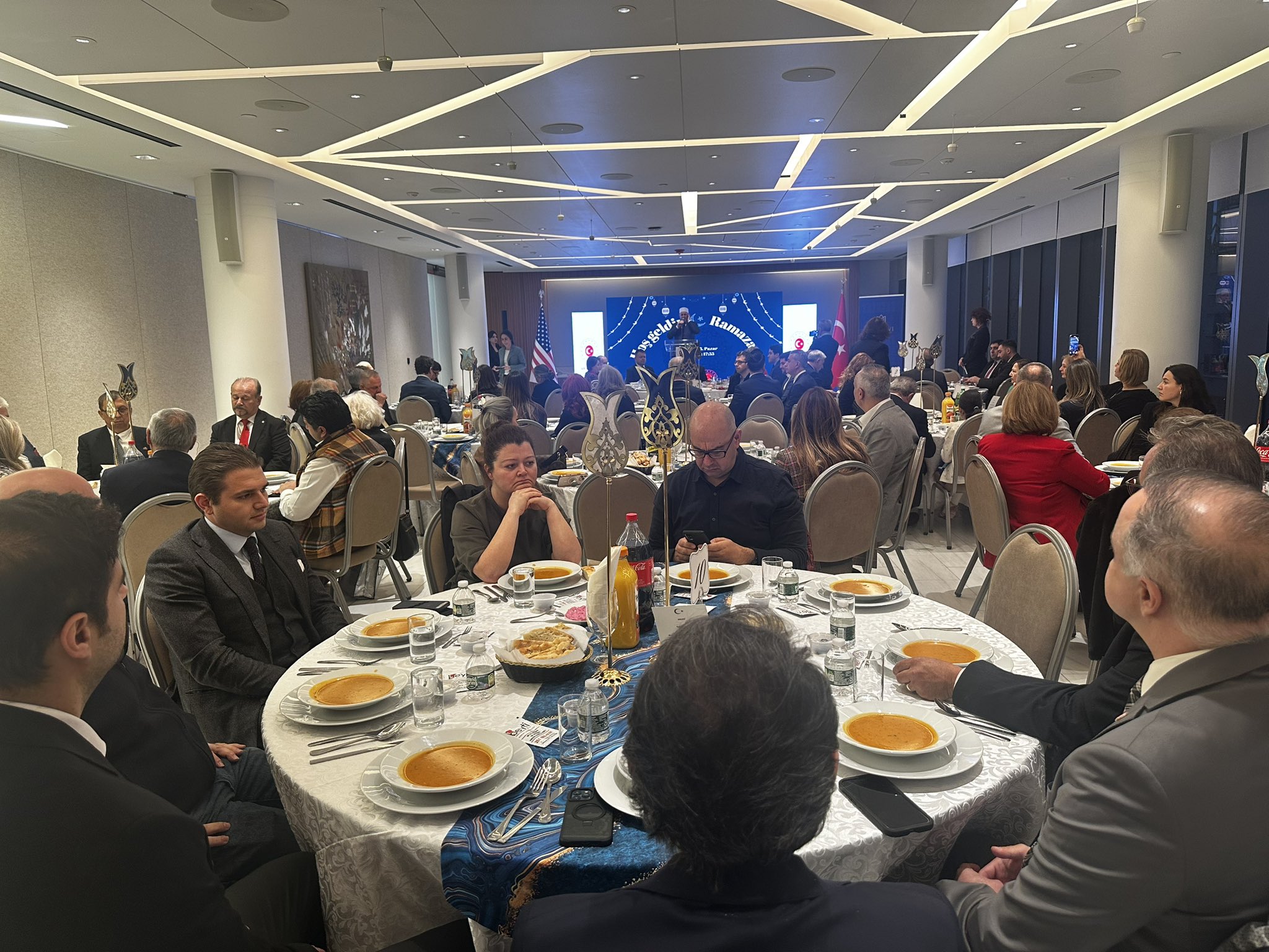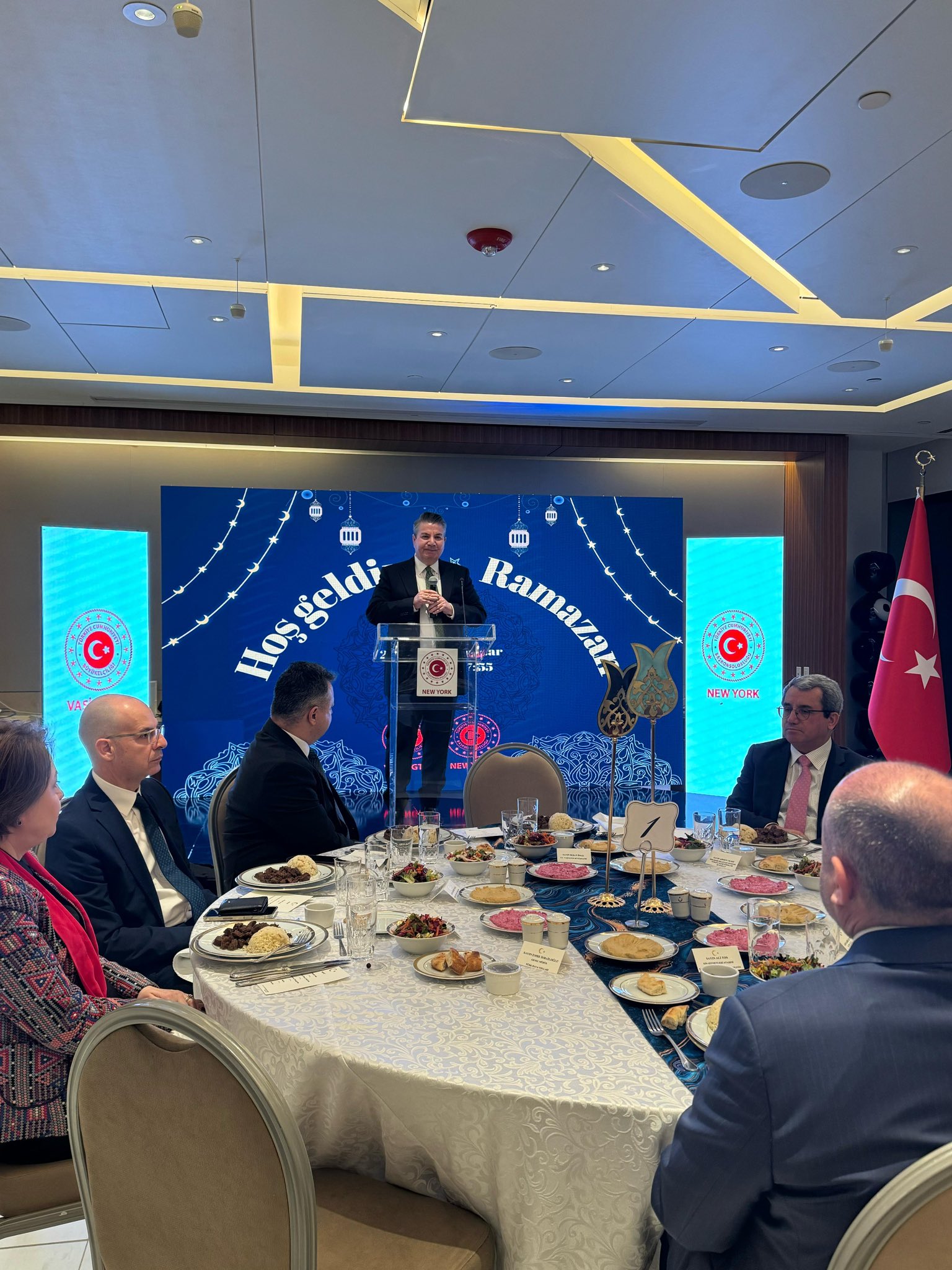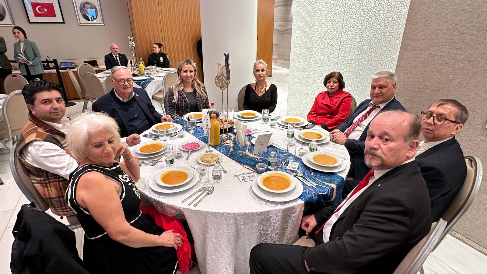 İftar, Diyanet Ataşesi Ali Tos’un okuduğu ezanla açıldı ve davetliler, birlik ve beraberlik duygusu içinde sofralarını paylaştı. New Jersey'deki ünlü Beyti Restaurant tarafından hazırlanan iftar menüsü, davete katılanlar tarafından büyük beğeni topladı.
