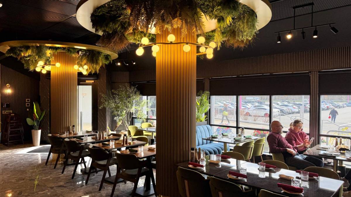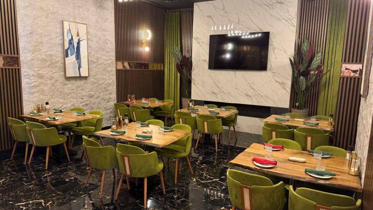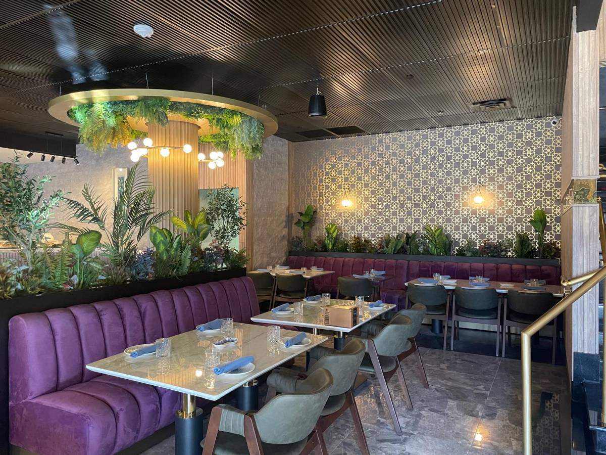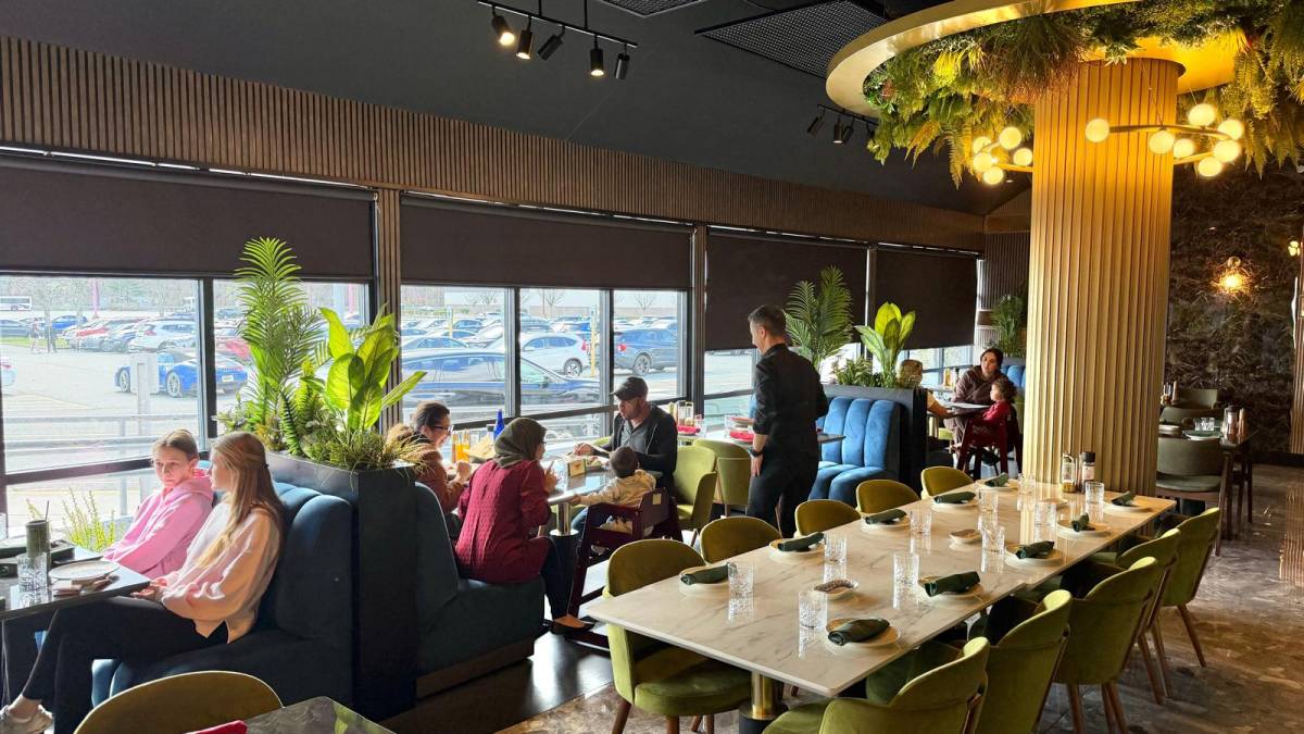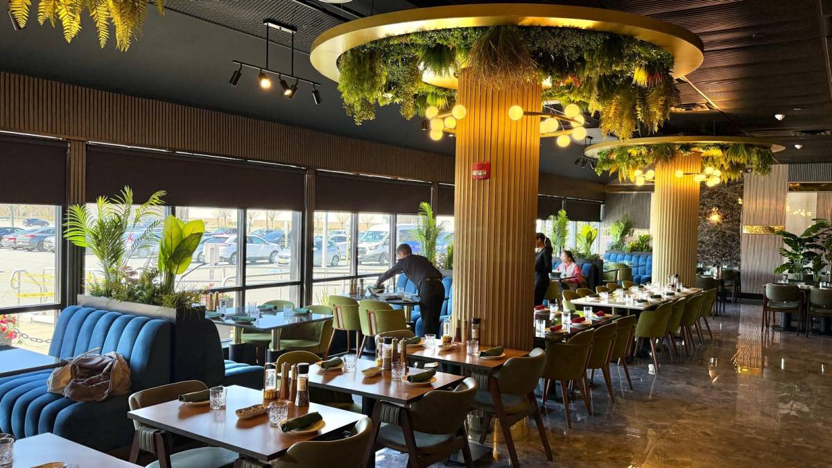 Tavandan duvarlara kadar kullanılan yeşil bitkiler, ferah iç tasarım, yüksek tavan yapısı ve modern detaylar sayesinde misafirler kendilerini klasik bir restoranda değil, doğayla iç içe şık bir yaşam alanında hissediyor.