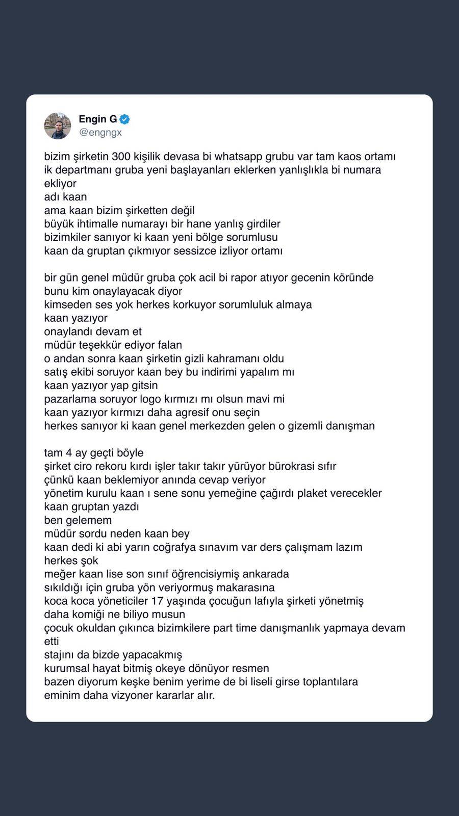 X platformunda bir kullanıcının anlattığı hikaye, sosyal medyada gündem oldu. İddiaya göre; WhatsApp grubuna yanlışlıkla eklenen bir numara, dev bir şirketin kaderini değiştirdi. Herkes onu 'yeni bölge sorumlusu' sandı, o ise 'makara olsun' diye milyonluk kararlara imza attı. Şirket ciro rekoru kırıp plaket töreni düzenleyince, 'gizemli kahramanın' coğrafya sınavına çalışan 17 yaşında bir liseli olduğu ortaya çıktı. Hikaye kısa sürede sosyal medyada viral olurken, bazı kullanıcılar ise anlatılanların tamamen kurgu olduğunu savundu.