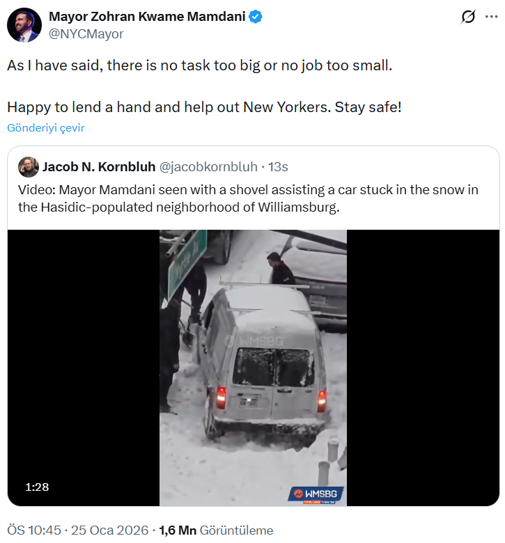 TheMirror’da yer alan habere göre, Bed-Stuy semtinde New York City Housing Authority (NYCHA) sakinlerine ait bir aracın karda sıkıştığını gören Mamdani, durarak kürek aldı ve aracı bulunduğu yerden çıkarmaya yardımcı oldu.